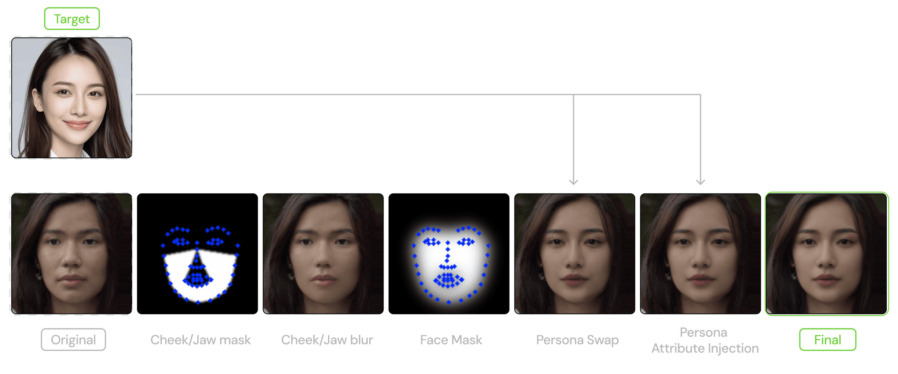Landmarks/segmentation precisely localize fusion and prevent spill into hair/background.